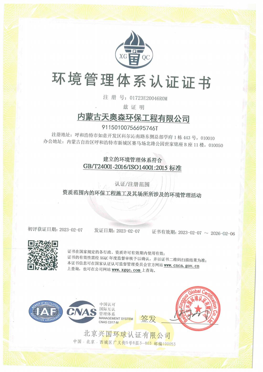 環(huán)境管理體系認(rèn)證證書(shū)