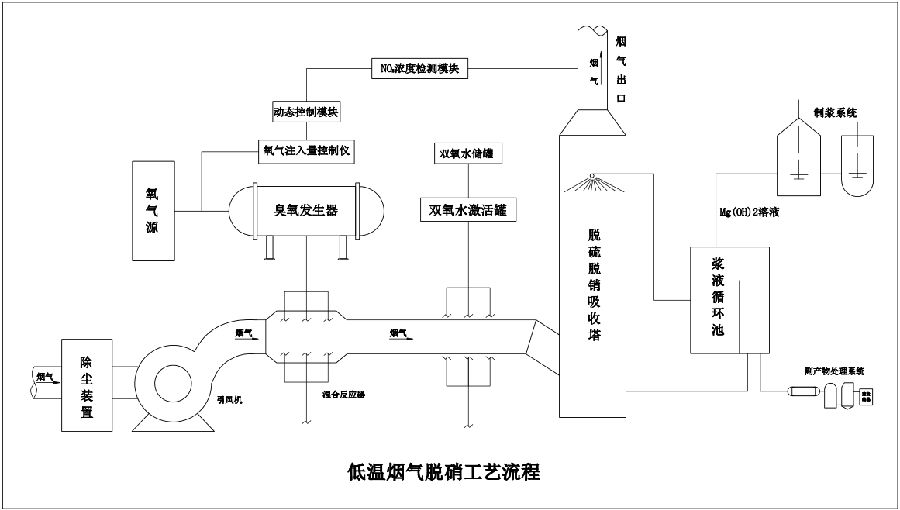 工藝原理:組合氧化法脫硝主要是利用臭氧和雙氧水的強氧化性,將不可溶的低價氮氧化物氧化為可溶的高價態氮氧化物,然后在洗滌塔內將氮氧化物吸收,達到脫除的目的。
